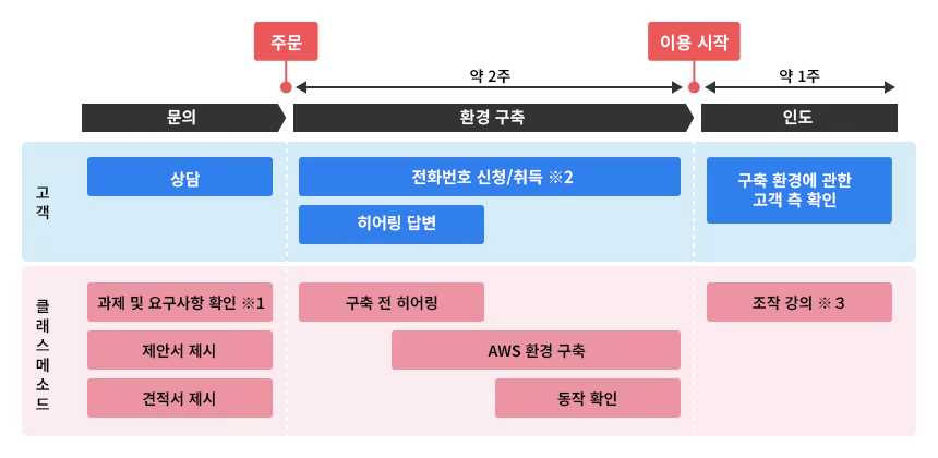 클래스메소드가 제안한 것은 "스타트 패키지 for Amazon Connect". 사전에 패키지화된 클라우드 컨택 센터 환경 일체를 20만 엔(세금 별도) · 2주 만에 제공하는 서비스입니다. 통화 기능, 컨택 플로우, 통화 녹음, Contact Lens를 활용한 음성 텍스트 변환 · 감정 분석 등 필요한 기능을 기본 탑재하며, 운영 교육도 포함되어 있습니다.